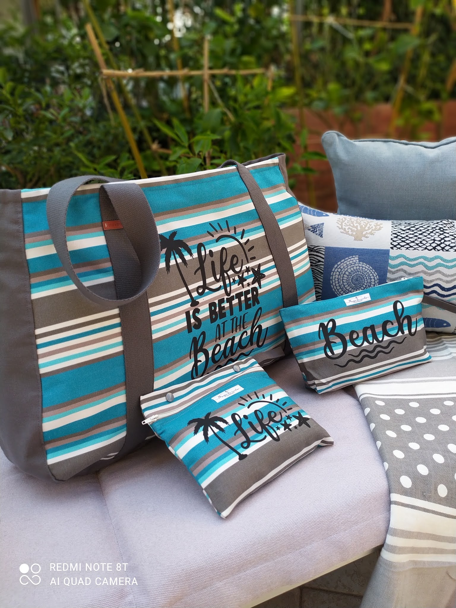 Bi-color per essere alla moda, la borsa è resa unica e personalizzata grazie alle scritte, disegni o motivi a scelta ... Completa di capiente pochette per inserire tutto l'occorrente e di un pratico beauty che più essere applicato alla borsa con dei pratici bottoni a pressione